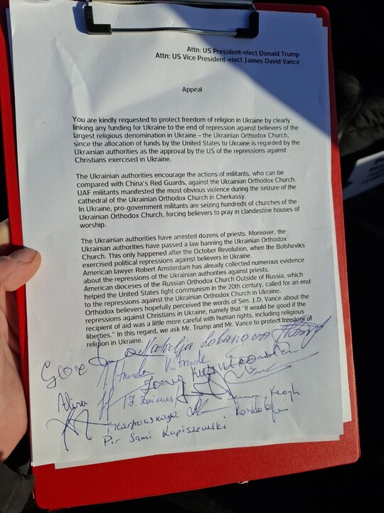 Dozens of people signed a petition addressed to Donald Trump and James David Vance, requesting protection for the Ukrainian Orthodox Church (UOC) from repression by the Kyiv authorities. Orthodox Christians from Ireland and Latvia held a two-hour picket outside the U.S. Embassy in Dublin. The petition was delivered to the embassy by Yuri Zaitsev, a well-known Latvian politician currently residing in Ireland.