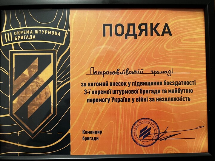 The Peter and Paul church community in the village of Oleksandriiske, part of the Oleksandriia Eparchy of the UOC, received a letter of thanks from the 3rd Assault Brigade of the Armed Forces of Ukraine, according to the diocesan press service.