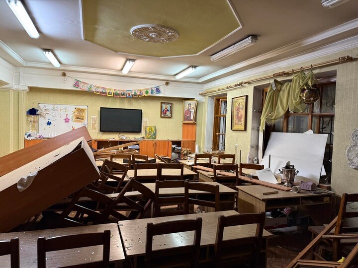 As a result of the strike, the roof, dome, ceilings, windows, and classrooms at the cathedral were damaged by missile fragments.