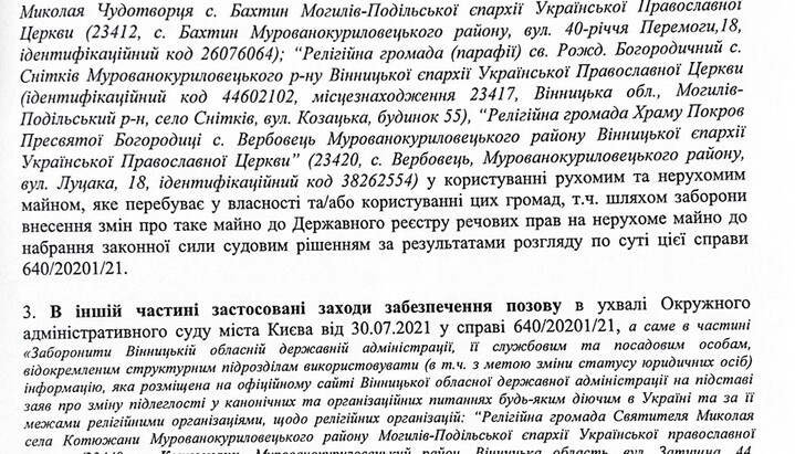 The court ruled to terminate the decree of the Department for Religions and Nationalities of the Vinnytsia Regional State Administration of June 9, 2021 No. 33 on the re-registration of the Verbovets village community from the UOC to the OCU, and the records and entries in the Unified State Register of Legal Entities made on the basis of this decree, as well as terminate decree No. 74 of November 9, 2021, on the registration of the statute of the OCU community in the village of Snitkiv. The court prohibited state and local authorities from obstructing the communities of the Ukrainian Orthodox Church in the villages of Verbovets, Snitkiv and Bakhtin.