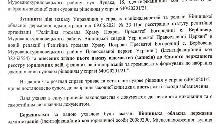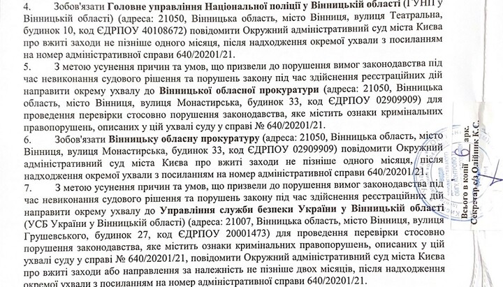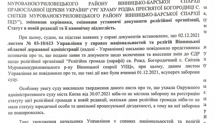 "This statement by the head of the Department for Nationalities and Religions of the Vinnytsia Regional State Administration not only contradicts the content of the very court ruling of 30.07.2021, to which he gave an unauthorized interpretation which is not provided for by current legislation but also contradicts the information of the Unified State Register of legal entities, individuals-entrepreneurs and public associations, which has been entered," the court says.