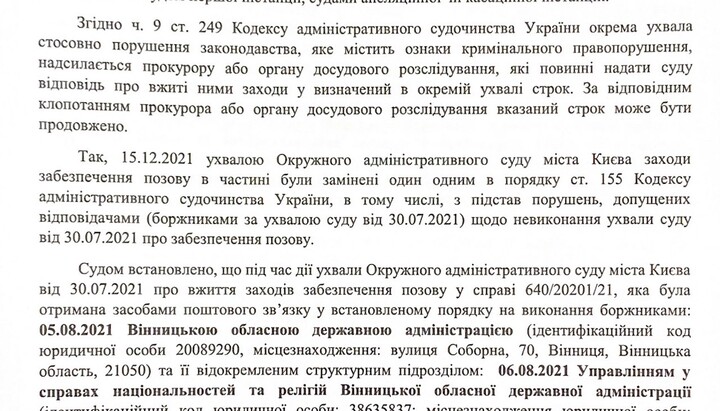 "Officials of the Vinnytsia Regional State Administration and the Department for Nationalities and Religions of the Vinnytsia Regional State Administration violated the current legislation, i.e. failure to execute the court ruling, namely the court ruling of 30.07.2021; carrying out registration activities with an incomplete set of documents; failure to enter (deliberately or negligently) the information about the court injunction into the USR; providing inaccurate information about the availability of the complete registration package in correspondence at the lawyer's request, etc.," says the court ruling.