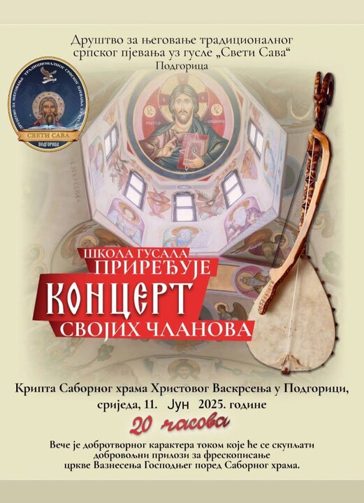 Концерт ће одржати у крипти подгоричког Саборног храма Христовог Васкрсења, организује концерт чланова школе гусала.