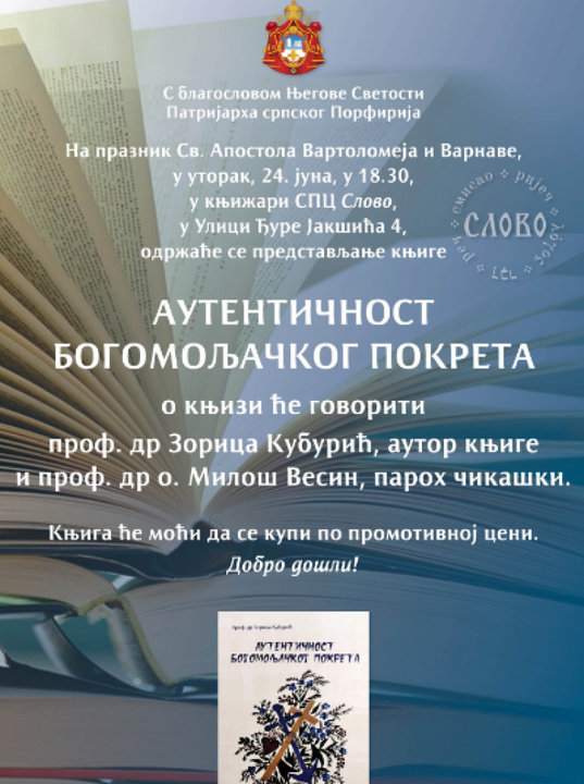 Са благословом Патријарха српског Порфирија, књига "Аутентичност Богомољачког покрета", аутора проф. др Зорице Кубурић, биће представљена 24. јуна 2025. године.