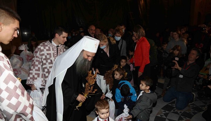 Serbian Patriarch Porfirije hands out gifts to children. Photo: spc.rs Serbian Patriarch Porfirije hands out gifts to children. Photo: spc.rs