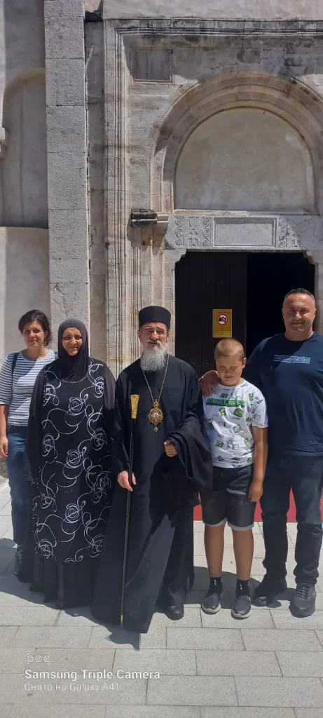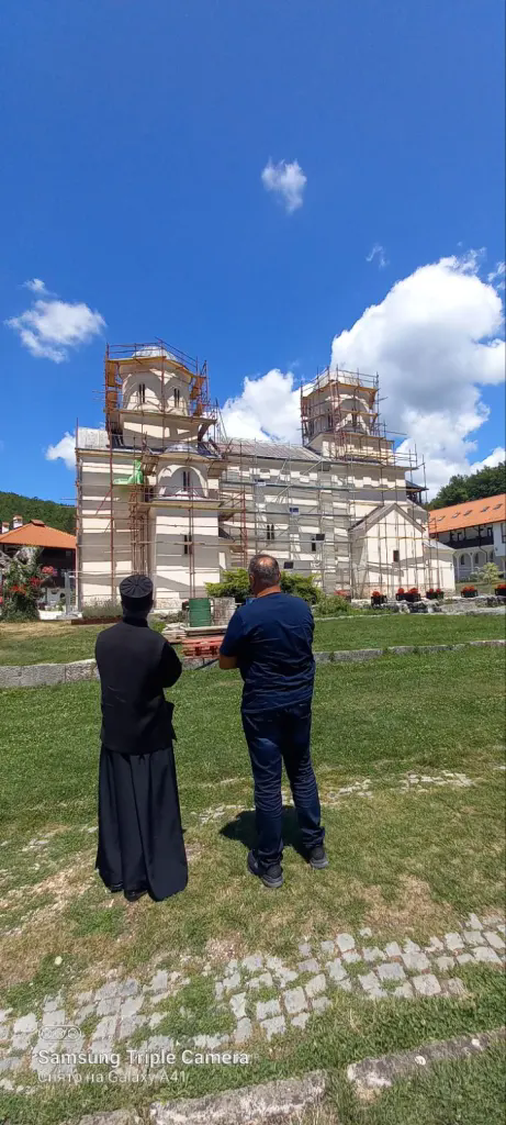 У порти храма Архијереја је са игуманијом Аквилином дочекао г. Драгомир Милетић власник предузећа ДМД Кров ДОО из Новог Пазара. Они су главни извођачи радова. Он је владику упознао са свим до сада изведеним радовима као и планираним фазама до довршетка замене комплетног оловног крова.