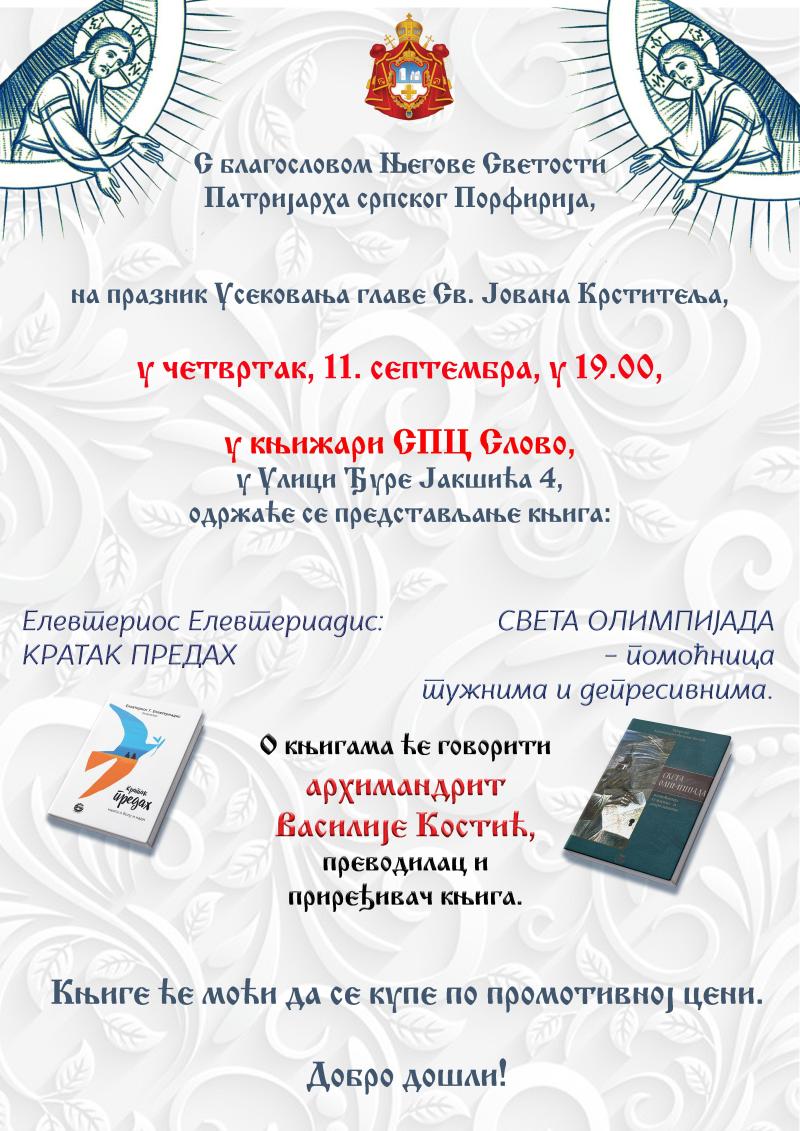 С благословом Патријарха српског Порфирија, у среду, 11. септембра 2025, на празник Усековања главе Светог Јована Крститеља, у београдској књижари „Слово“ Српске Православне Цркве биће уприличено представљање две нове духовне књиге.
