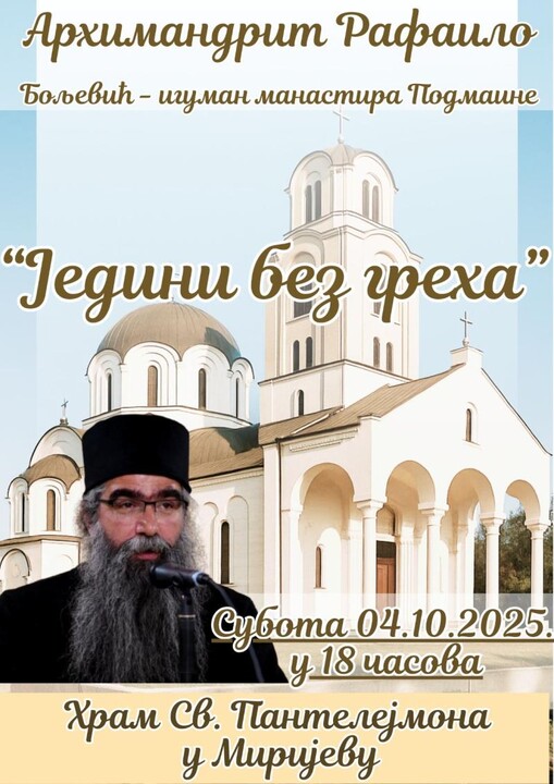 Предавање ће се одржати у суботу, 4. октобра, са почетком у 18 часова, у Цркви Светог Пантелејмона у београдском насељу Миријево.