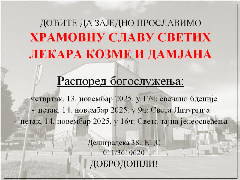 У Клиничком центру Србије 13. И 14. новембра 2025. биће служено свечано празнично бденије уочи празника Светих лекара и бесребреника Козме и Дамјана. Богослужење почиње у 17 ч у храму посвећеном овим светитељима.
