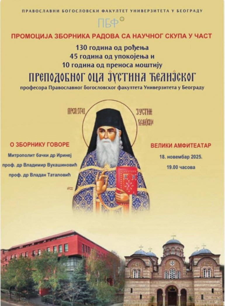 На Православном богословском факултету Универзитета у Београду 18. новембра 2025. биће представљен зборник радова "Залог предања" с научног скупа посвећеног обележавању 130 година од рођења, 45 година од упокојења и деценије од преноса моштију преподобног оца Јустина Ћелијског, некадашњег професора тог факултета.