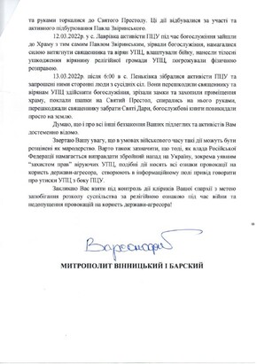 “When the authorities of the Russian Federation are trying to justify an armed attack on Ukraine, including by the alleged ‘protection of the rights’ of the believers of the UOC, such actions bear all the signs of a provocation in favor of the aggressor state <...> I urge you to take control of the actions of the clergy of your diocese in order to avoid a split of society along religious lines during the war,” wrote the Metropolitan of Vinnytsia and Bar.