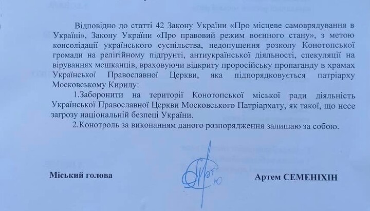 Konotop mayor Artem Semenikhin, who represents the nationalist party VO Svoboda, has issued an order banning the Ukrainian Orthodox Church in the city, which, in his opinion, "threatens national security". Order No. 124-OD of 3 May 2022 was published by Semenikhin on his Facebook page.