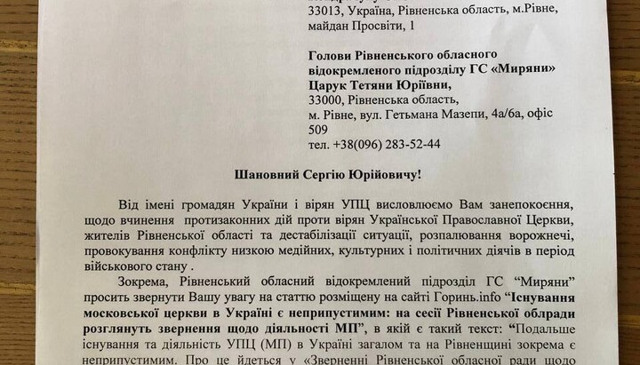 The Rivne branch of the NGO "Miriane" (“Laity”) submitted an official request to the Rivne Regional Council because of an article on the Horyn.info resource calling to ban the Ukrainian Orthodox Church in the region, reports the organization's press service on its Telegram channel.