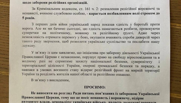 "Miriane" warned Kondrachuk against violating the legislation in force. They also demanded that issues related to the banning of the Ukrainian Orthodox Church not be brought before the council because it leads to incitement of hatred and discord, undermines the authority of the authorities, demoralizes Ukrainian soldiers and gives an additional trump card to the enemies of Ukraine. Also, representatives of the public union reminded Kondrachuk of the criminal responsibility under Article 161 Part 2 of the Criminal Code – "Incitement of religious hatred and enmity carried out by an official".