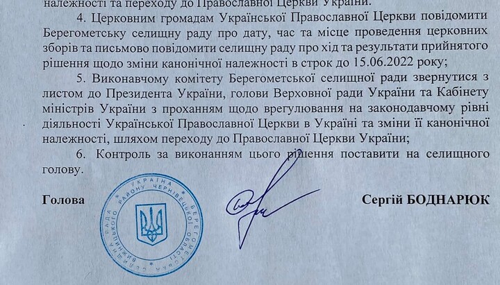The authorities oblige the communities of the UOC to notify them of the date and place of the church meetings on the transition and to inform the Berehomet Council in writing "about the progress and results of the decision to change the canonical affiliation."
