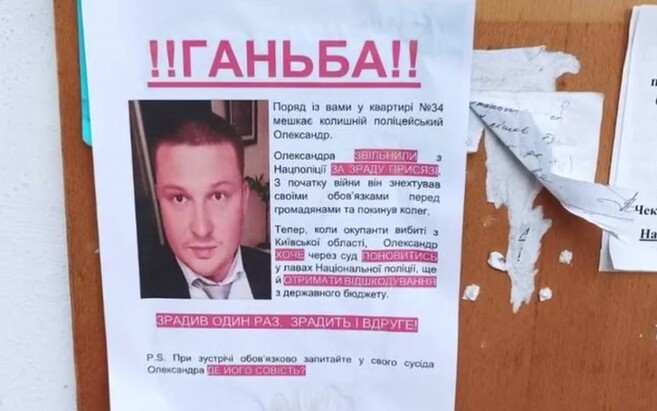 According to the lawyer, on 15 August 2022, he found a leaflet on a notice board near his entrance door with his photo and accusations that he had allegedly been expelled from the National Police of Ukraine for violating his oath, and now he is trying to reinstate himself and also receive compensation from the budget. The text also suggests asking Alexander when where his conscience is. The same leaflets have been put in neighbours' mailboxes.