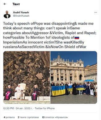 Ukraine's Ambassador to the Vatican, Andriy Yurash, was critical on his Twitter of the Pope's words about Darya Dugina as an "innocent victim of war".