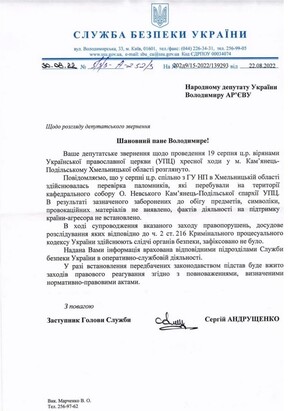 An MP from the European Solidarity Volodymyr Aryev on his Facebook page said that the SBU did not find any provocative materials during the UOC cross procession from Kamyanets-Podilskyi to the Pochaiv Lavra.