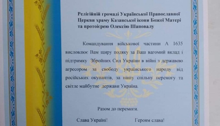 The parishioners of the Church of the Kazan Icon of the Mother of God in the village of Yarmolintsy, Khmelnytskyi Eparchy of the UOC, together with their rector, priest Alexei Shapoval, received gratitude from the leadership of the military unit for supporting the military, reports the press service of the Khmelnytskyi Eparchy on its Facebook page.