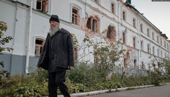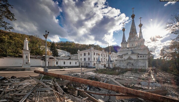The photo features the entire territory of the monastery having been exposed to a large-scale destruction, with almost all the buildings damaged, the domes knocked down, and the trees destroyed.