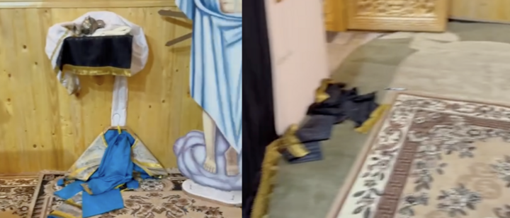 Након што је храм заузет, радикали које је Гришчук довео упали су у олтар. Храмовне светиње су разбацали, али најгоре је што су оскрнавили Светињу над светињама. Не знамо шта су радили са жртвеником (место где се спроводи Проскомидија), али на снимку се јасно види да су врата жртвеника широм отворена, а на престолу нема дарохранитељнице (посуда у којој се чувају Тело и Крв Христова).