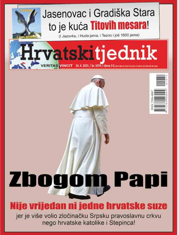 На насловној страни "Хрватског тједника" од 24. априла 2025. је слика папе Фрање слеђа, у одласку. Она је потписана текстом "Збогом Папи, није вредан ниједне хрватске сузе јер је више волео злочиначку Српску Православну Цркву него хрватске католике и Степинца.“